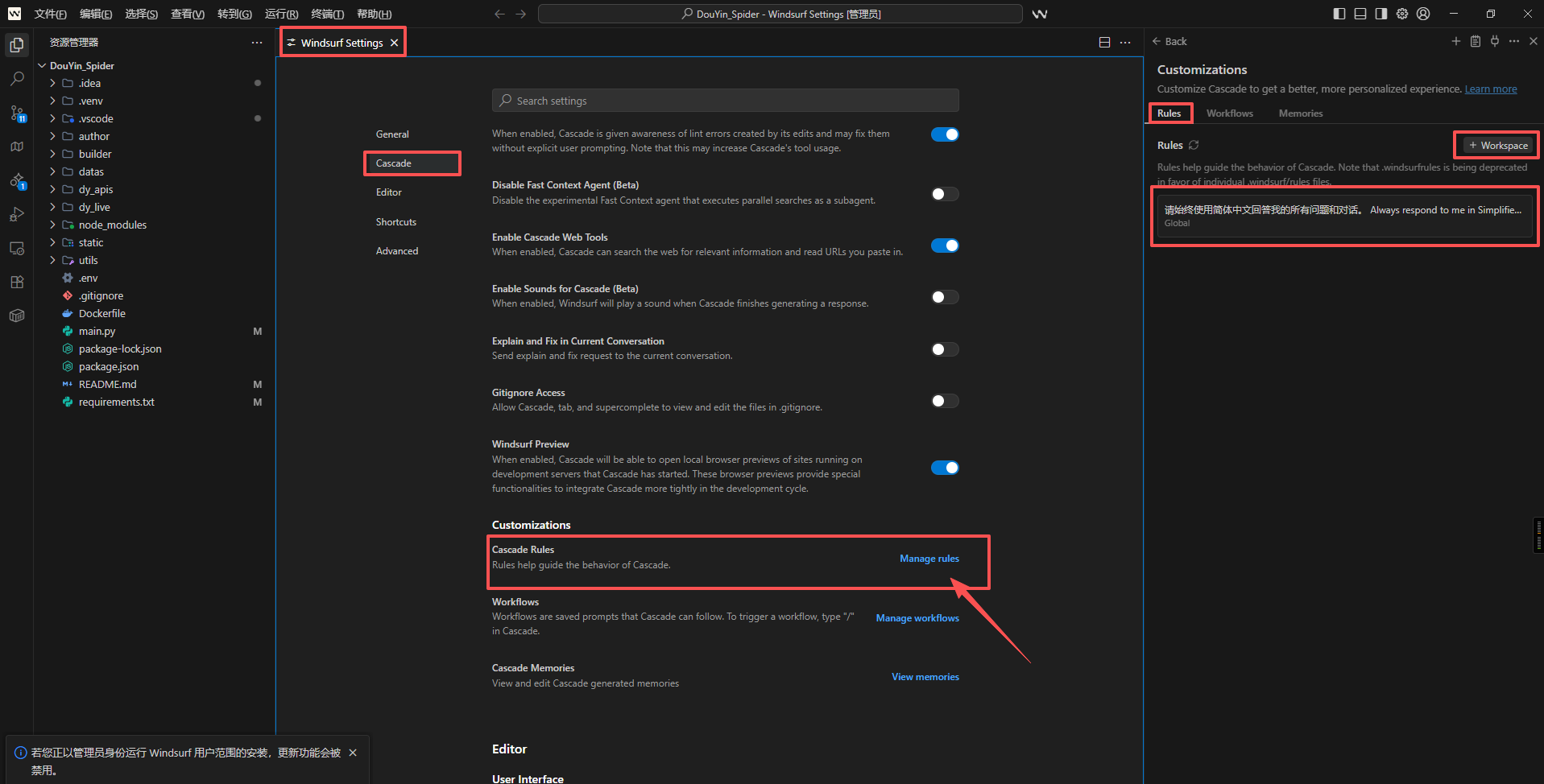 1.打开设置 2.按照图片的方案步骤进行处理 3.添加全局提示词 请始终使用简体中文回答我的所有问题和对话。 Always respond to me in Simplified Chinese (zh-CN).